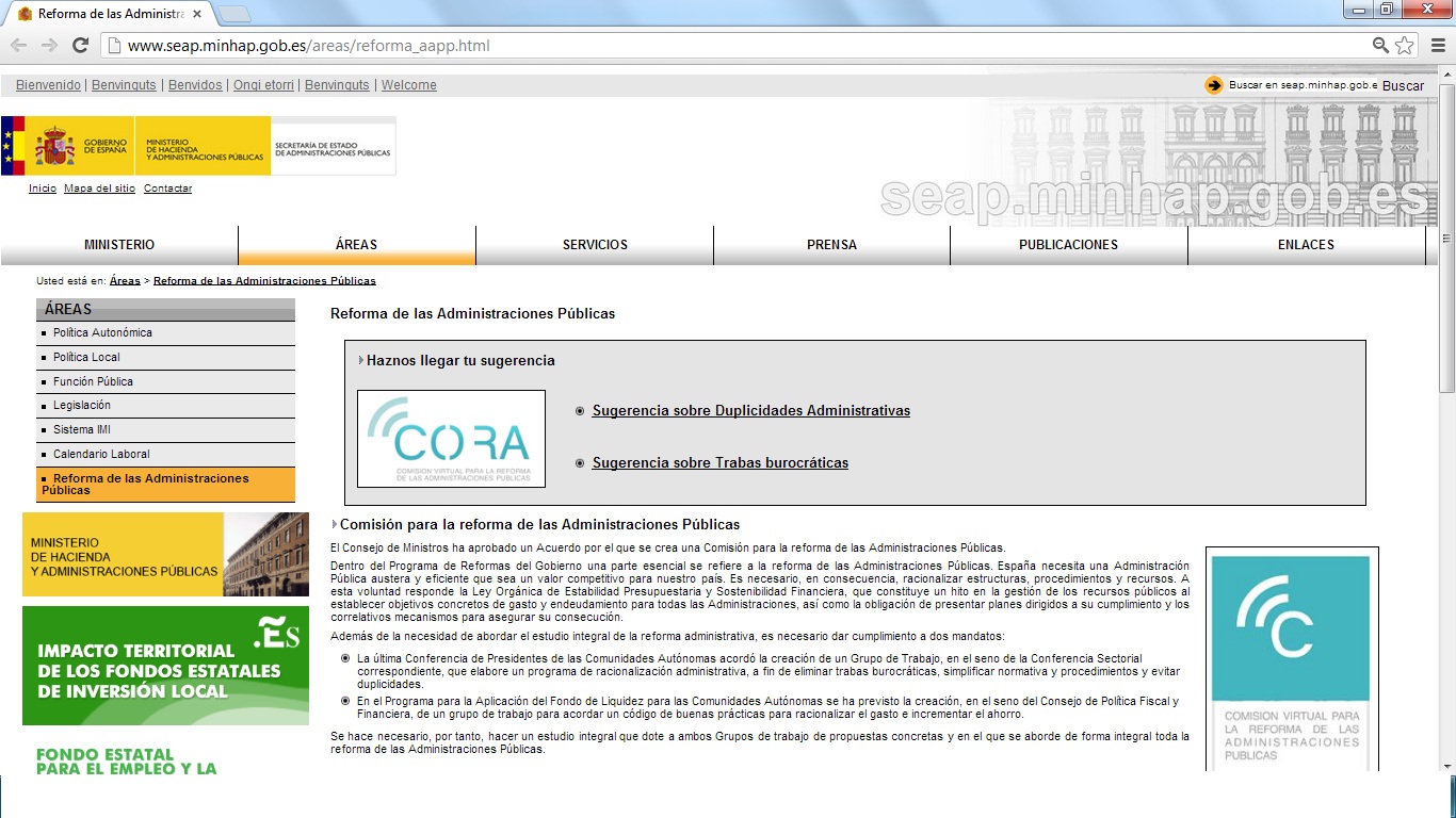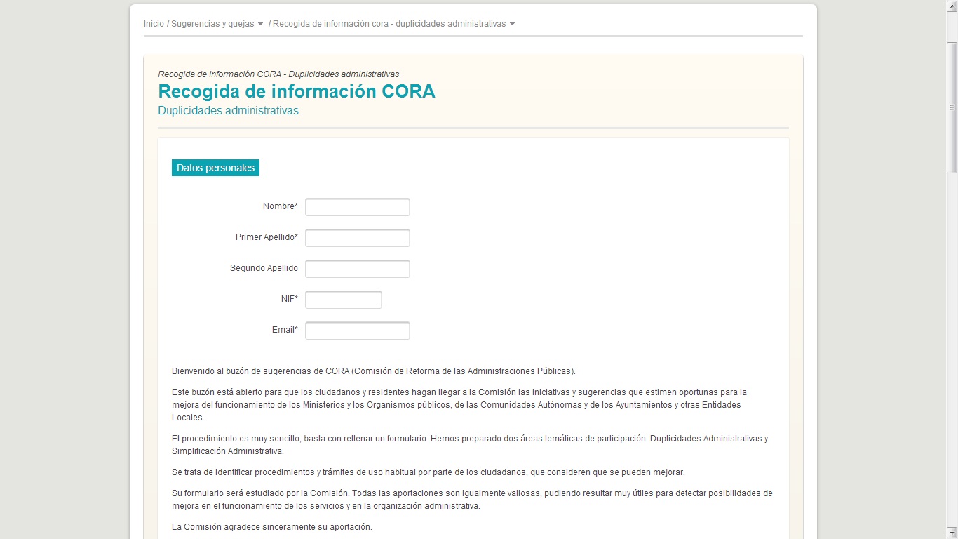 A principios de enero de 2013 El Derecho.com publicaba un contundente titular: «El buzón de sugerencias de CORA (Comisión de Reforma de las Administraciones Públicas) incumple la LOPD». El artículo concluía que el Final del formulario