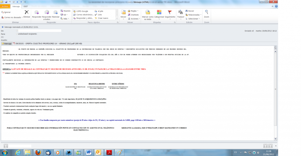 La oferente, (creo que la correduría de una gran aseguradora), no es nada tonta; el asunto del mensaje es muy gráfico: “OFERTA COLECTIVO PROFESORES UV - REF. 163022 - Derecho Constitucional”. No busque el autor la palabra “PUBLI”, ¡nada!: envío a saco a la lista de distribución de mi departamento universitario. Además, ¿para qué pedir consentimiento?, la aseguradora ya nos dice “PUNTUALMENTE RECIBIRÁ LA INFORMACIÓN DE LAS OFERTAS Y PROMOCIONES EN SU CORREO CORPORATIVO SI NO INDICA LO CONTRARIO”. Y, por supuesto, no busquen un modo de cancelar el dato u oponerse al tratamiento más allá de esta críptica frase. Pero, en el fondo estoy feliz, me hacen precio para una caja de madera de pino, -la cual de ser usada evidentemente le resolvería un problema de liquidez al erario público ya que se ahorraría no una sino 14 pagas de golpe-, y además me regalan una visita al Spa, un desayuno con colesterol que ya tengo ataúd por si hace falta, y una visita a una bodega para dos personas a ver si me mato en algún caminito de montaña y uso rápido el seguro.
